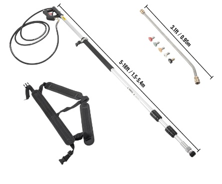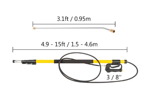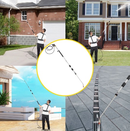 Lungimea adaptorului telescopic este reglabilă între 1,5 și 5,4 metri, permițându-vă să accesați cu ușurință locurile care altfel ar fi greu sau imposibil de curățat. Fie că este vorba de acoperișuri înalte, balcoane, ferestre sau orice altă suprafață greu accesibilă, designul telescopic permite o curățare eficientă.